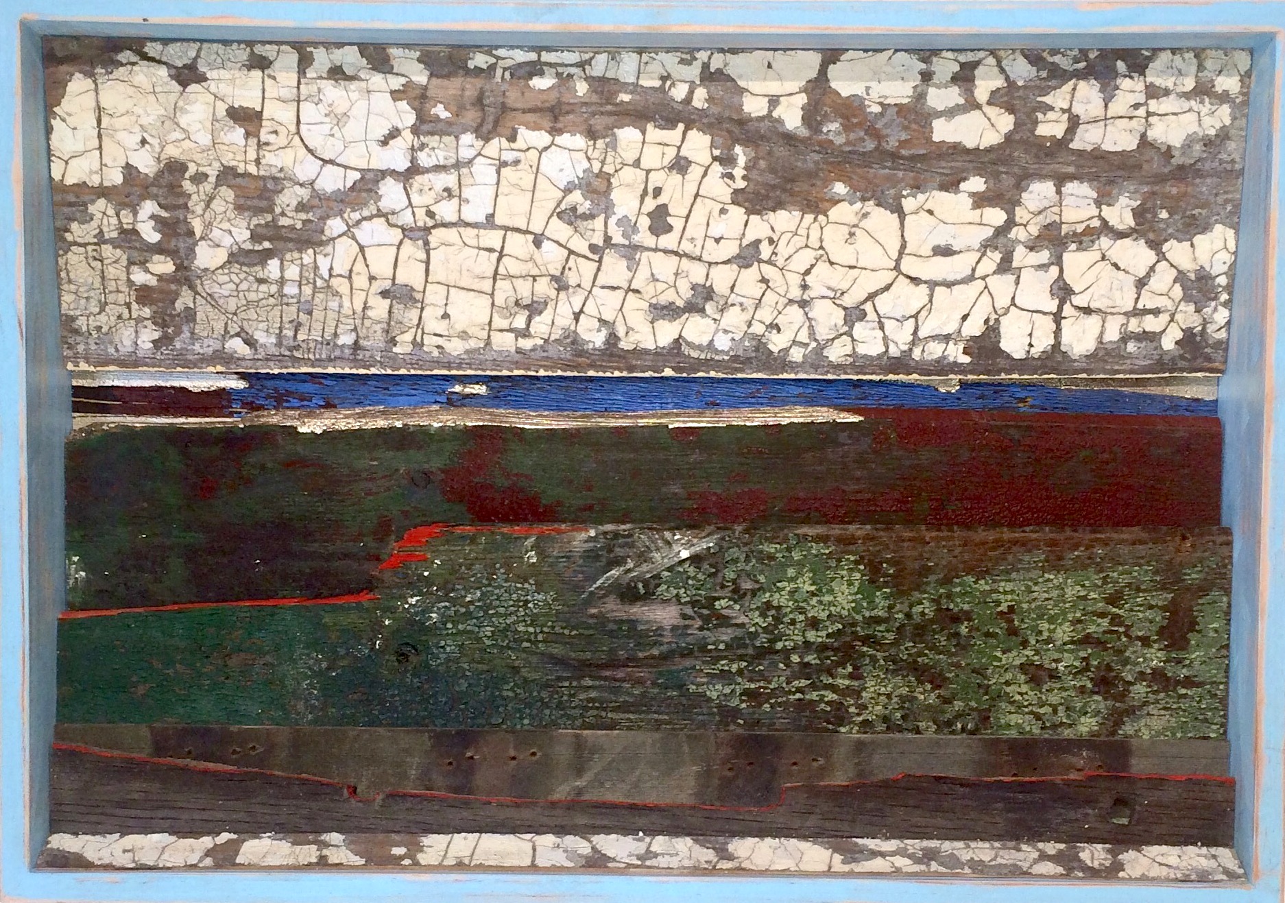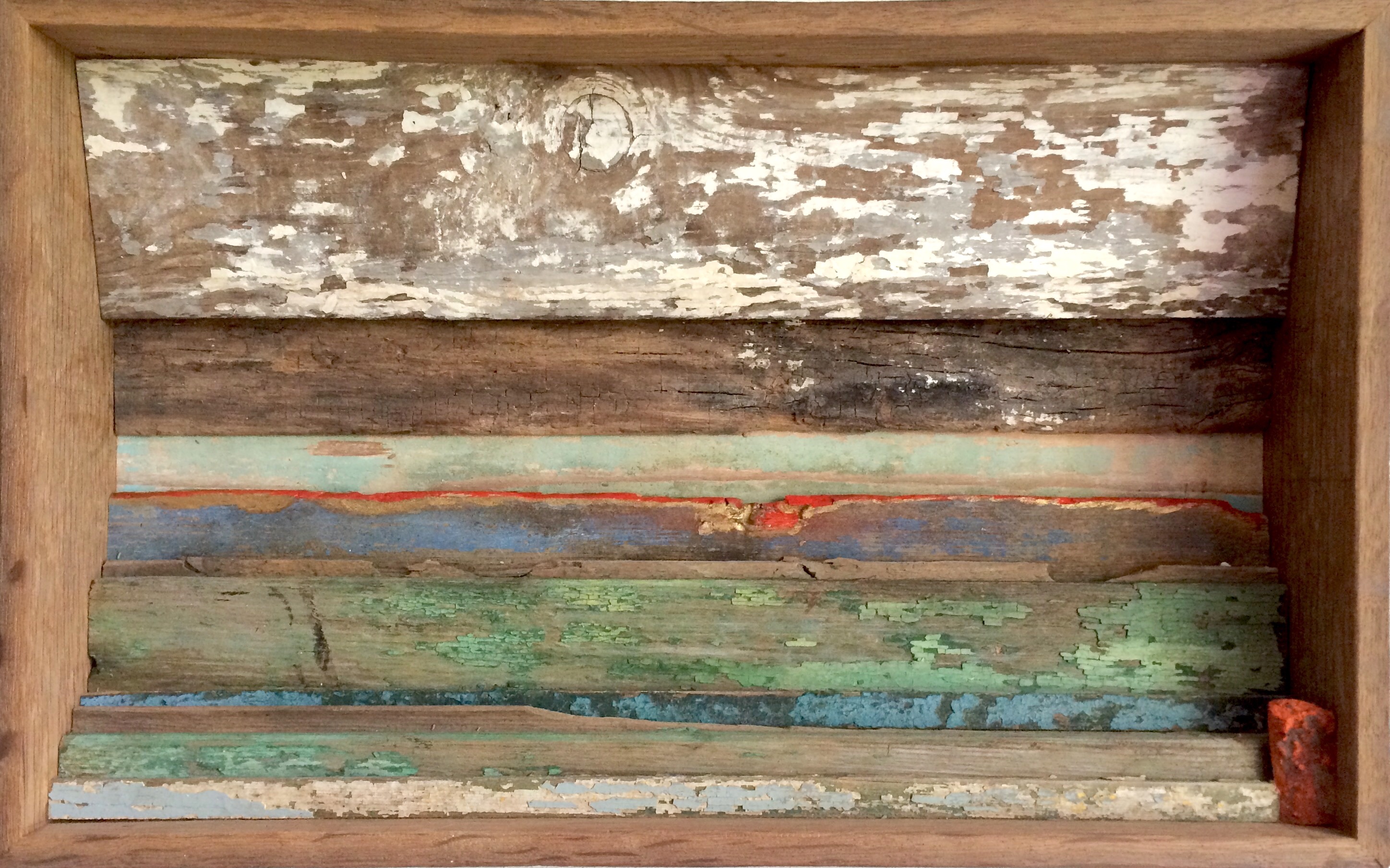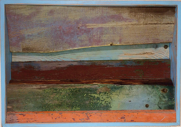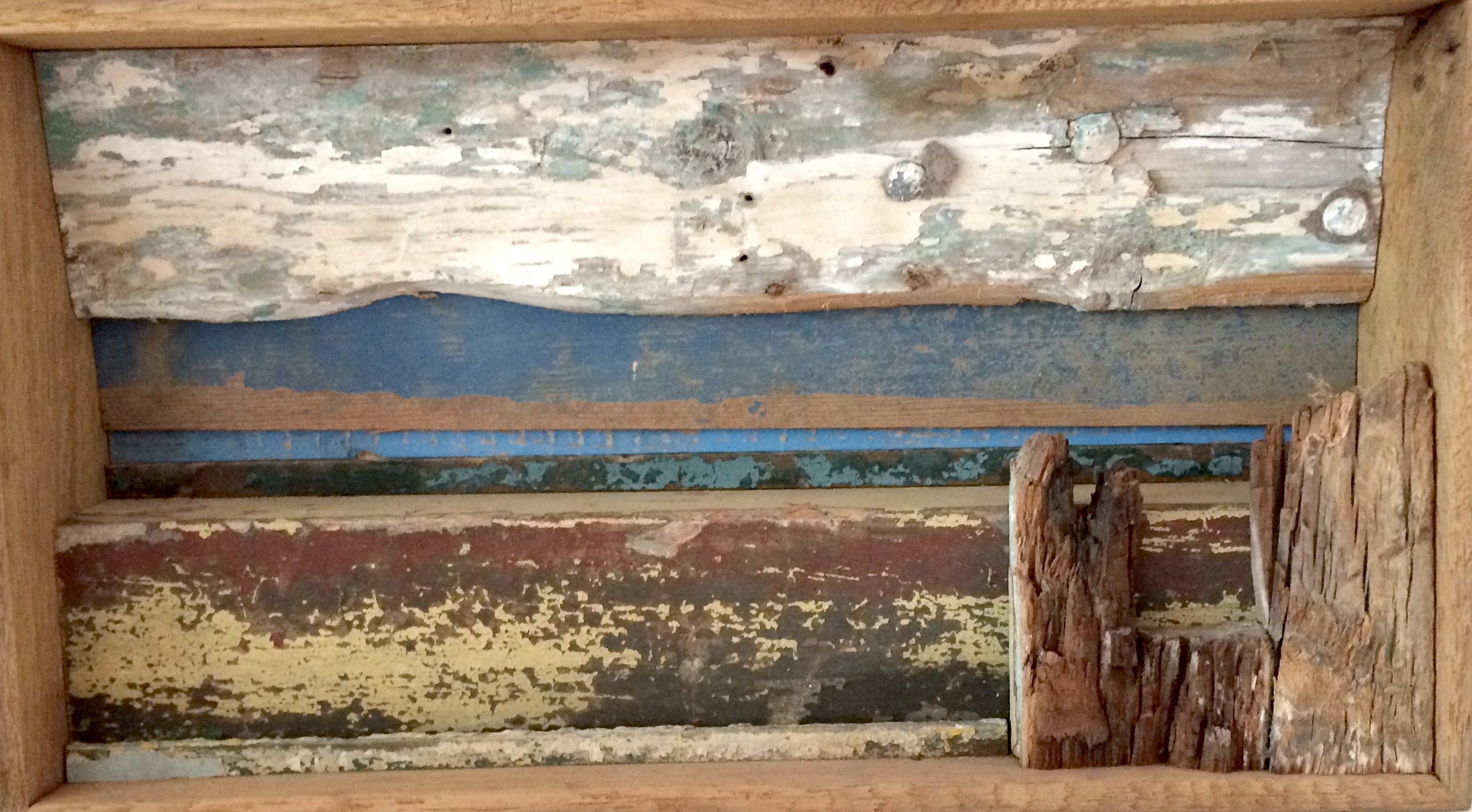 Alte Fundhölzer, immer mit Farbe, oder mit Strukturen. Oft in einem Zusammenhang gefunden, der schon ein Konzept für eine Jahreszeit und Landschaft Typus, anbietet. Die Kästen, die die Landschaft dann als Rahmen aufnehmen, sind auch immer aus Fundhölzern gebildet.