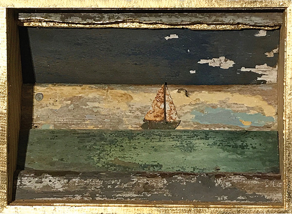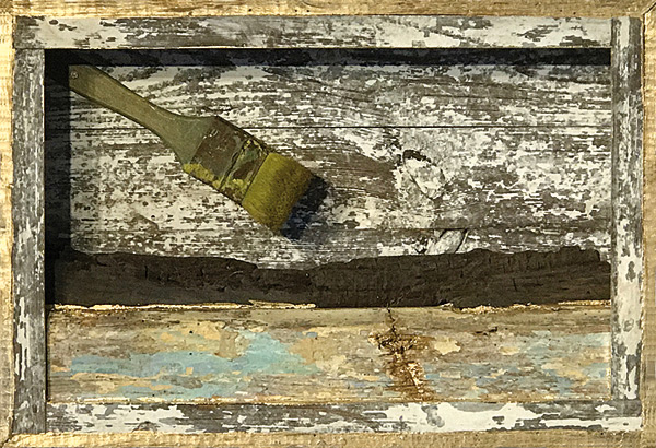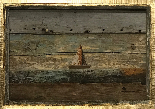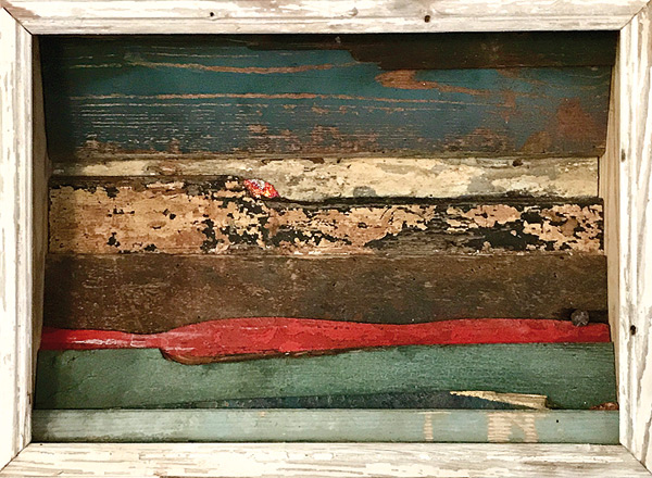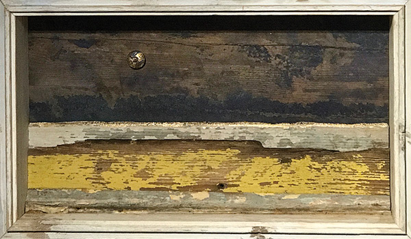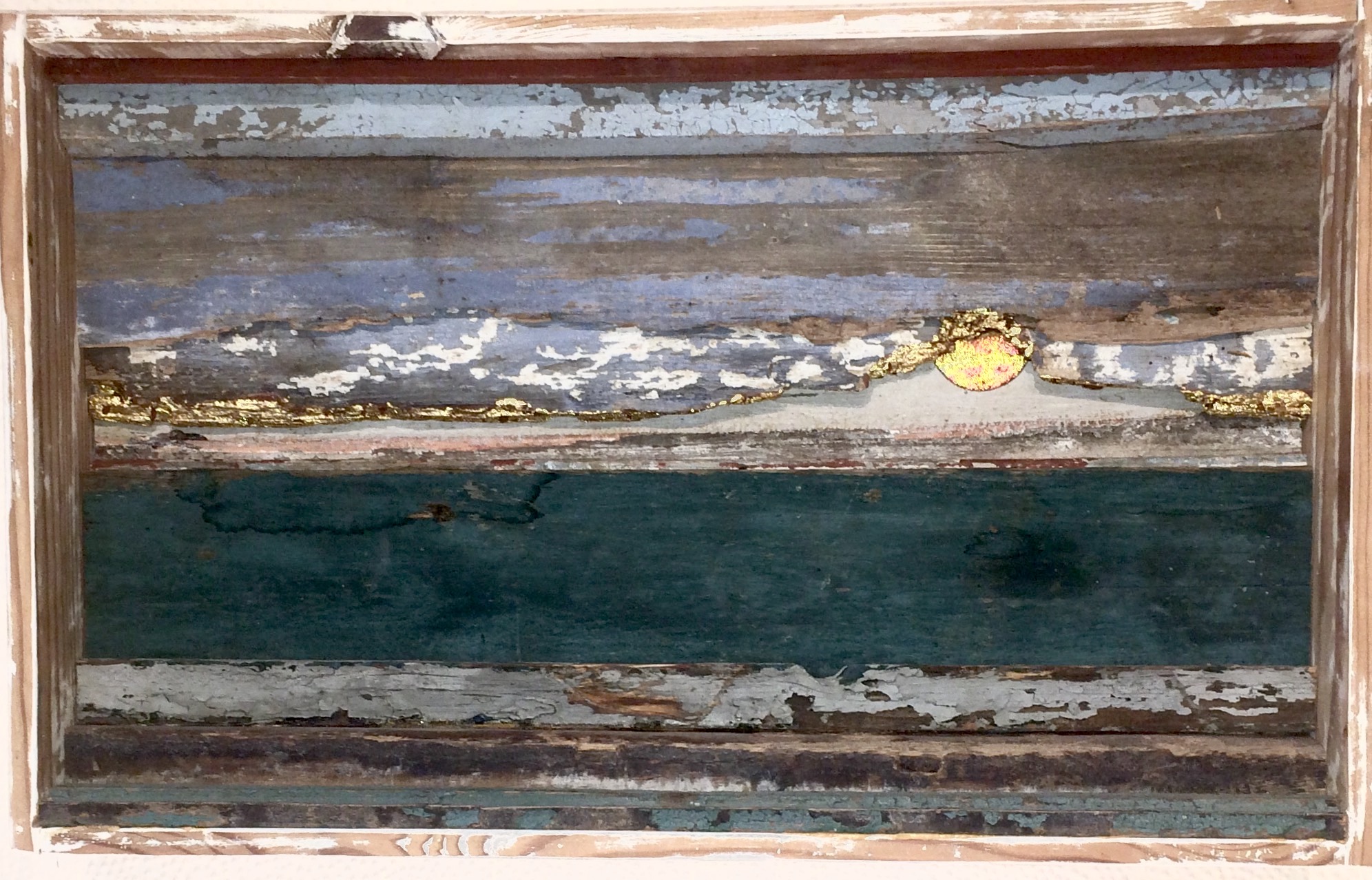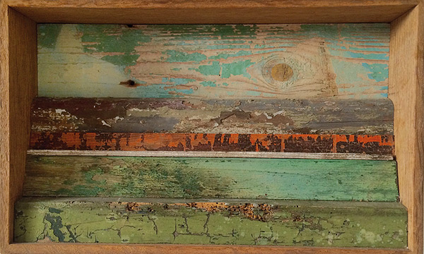 Alte Fundhölzer, immer mit Farbe, oder mit Strukturen. Oft in einem Zusammenhang gefunden, der schon ein Konzept für eine Jahreszeit und Landschaft Typus, anbietet. Die Kästen, die die Landschaft dann als Rahmen aufnehmen, sind auch immer aus Fundhölzern gebildet.